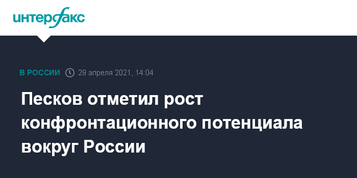"Действительно, можно с сожалением констатировать, что конфликтный потенциал, точнее конфронтационный, вокруг России имеет тенденцию к росту, это весьма тревожно", - сказал в программе "Большая игра" на Первом канале пресс-секретарь президента Дмитрий Песков.
