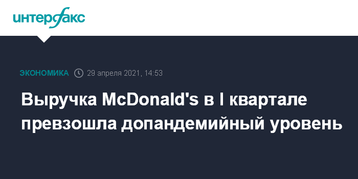"Наши глобальные сопоставимые продажи и выручка за первый квартал 2021 года превысили уровень первого квартала 2019 года несмотря на то, что во многих частях мира идет новая волна пандемии и есть ограничения на работу ресторанов", - сказал главный исполнительный директор McDonald's Крис Кемпчински, слова которого приводятся в сообщении.