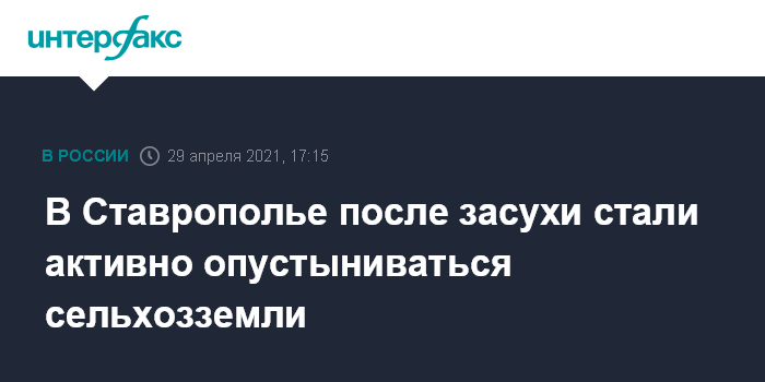 Москва. 29 апреля. INTERFAX.RU - Аграрии Ставропольского края столкнулись с проблемой опустынивания сельскохозяйственных земель после засухи в 2020 году, для ее решения планируют проводить фитомелиорацию. Об этом сообщил и.о. министра сельского хозяйства региона Владимир Ситников.