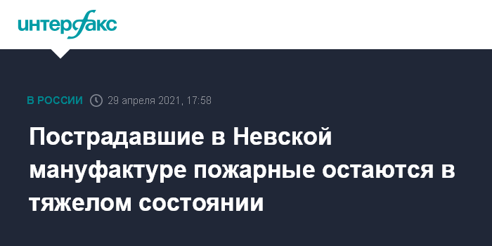 Москва. 29 апреля. INTERFAX.RU - Пострадавшие при тушении "Невской мануфактуры" в Петербурге пожарные Антон Соколов и Борис Старковский остаются в больнице, врачи оценивают их состояние как тяжелое, но стабильное. Об этом сообщила пресс-служба губернатора Александра Беглова после того, как чиновник навестил их в больнице.