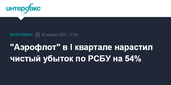 Москва. 30 апреля. INTERFAX.RU - ПАО "Аэрофлот" в I квартале 2021 года нарастило чистый убыток по РСБУ на 54% в сравнении с тем же периодом прошлого года, до 24,9 млрд руб., сообщила компания.