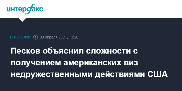 Москва. 30 апреля. INTERFAX.RU - Первопричиной сложностей с получением американских виз для россиян являются недружественные действия США, заявил пресс-секретарь президента РФ Дмитрий Песков.
