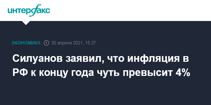 Москва. 30 апреля. INTERFAX.RU - Инфляция в России к концу 2021 года чуть превысит 4%, считает министр финансов РФ Антон Силуанов.