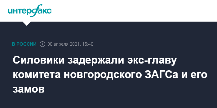 Москва. 30 апреля. INTERFAX.RU - Сотрудники правоохранительных органов по подозрению во взяточничестве задержали бывшего руководителя Новгородского областного комитета записи актов гражданского состояния и организационного обеспечения деятельности мировых судей (ЗАГС и ООДМС).