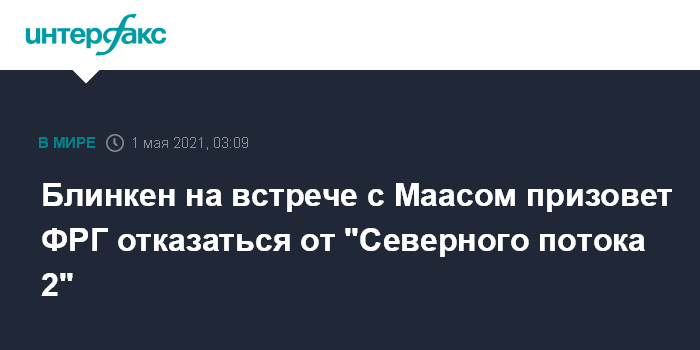 Москва. 1 мая. INTERFAX.RU - Госсекретарь США Энтони Блинкен в ходе встречи с министром иностранных Германии Хайко Маасом намерен в очередной раз призвать ФРГ отказаться от строительства газопровода "Северный поток 2", заявил исполняющий обязанности помощника госсекретаря США по делам Европы и Евразии Филип Рикер.