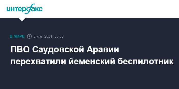 Москва. 2 мая. INTERFAX.RU - Средства ПВО Саудовской Аравии рано утром в воскресенье перехватили и уничтожили начиненный взрывчаткой беспилотник, пущенный йеменскими хуситами, целью которого являлся саудовский город Хамис-Мушаит, сообщили арабские СМИ.