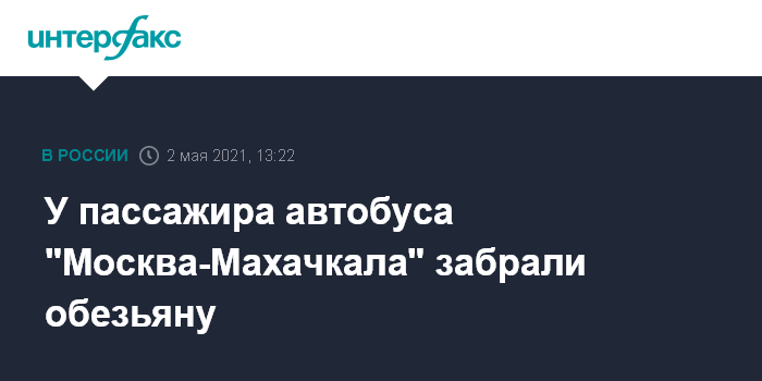 Москва. 2 мая. INTERFAX.RU - Полицейские в Волгоградской области в воскресенье остановили рейсовый автобус "Москва-Махачкала", в котором житель Дагестана перевозил обезьяну без документов, сообщает пресс-служба Главного управления МВД России по региону.
