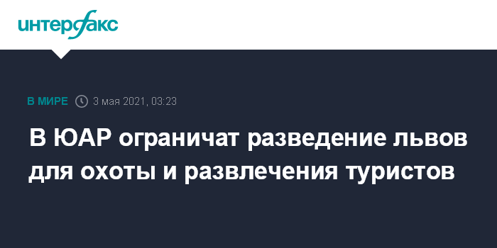 Москва. 3 мая. INTERFAX.RU - В ЮАР планируют ограничить разведение львов для охоты, а также контактных зоопарков. Об этом пишет BBC News.