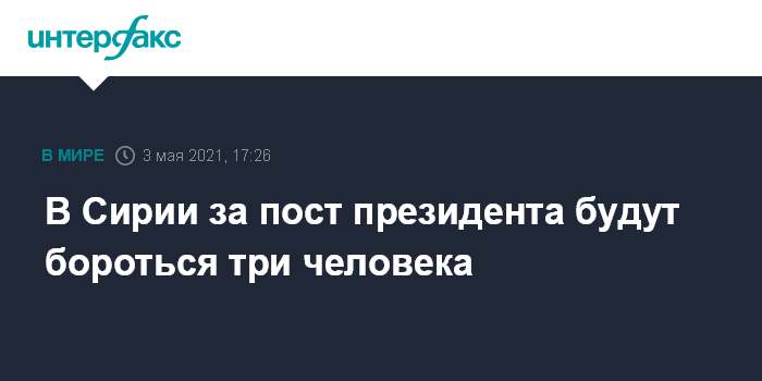 Москва. 3 мая. INTERFAX.RU - Конституционный суд Сирии в понедельник утвердил три кандидатуры для участия в предстоящих выборах президента страны, сообщает агентство САНА.