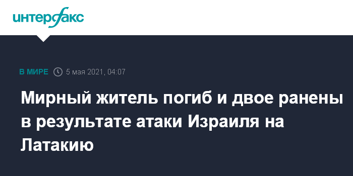 Москва. 5 мая. INTERFAX.RU - Жертвой израильского авиаудара по участку близ сирийских портов Латакия и Тартус стал мирный житель, сообщает сирийское государственное информационное агентство САНА.