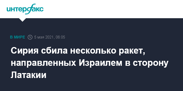 Москва. 5 мая. INTERFAX.RU - Средства ПВО Сирии сбили несколько израильских ракет, атаковавших Латакию, сообщила сирийская армия в среду.