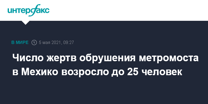 Москва. 5 мая. INTERFAX.RU - В результате крушения метромоста в Мехико, по последним данным, погибли 25 человек, сообщает в среду прокуратура мексиканской столицы в своем твиттере.