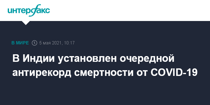 Москва. 5 мая. INTERFAX.RU - В Индии за минувшие сутки был побит очередной антирекорд смертности от COVID-19 - умерли 3780 заразившихся, пишет Times of India. Всего с начала пандемии в стране умерли 226 188 заболевших.