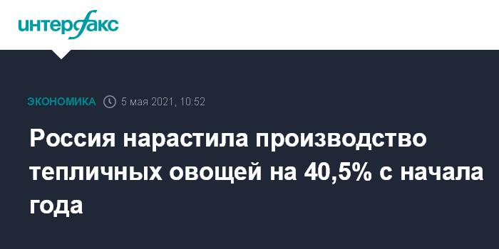 Москва. 5 мая. INTERFAX.RU - Россия с начала 2021 года увеличила производство овощей и зеленых культур в зимних теплицах на 40,5%, до 423 тысяч тонн с 301 тысяч тонн за аналогичный период 2020 года, сообщил Минсельхоз.