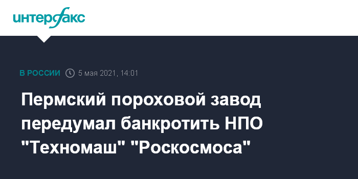 Пермский пороховой завод передумал банкротить НПО "Техномаш" "Роскосмоса"