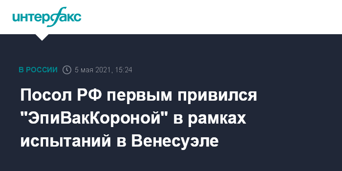 Москва. 5 мая. INTERFAX.RU - Венесуэла приступила к клиническим испытаниям российской вакцины от коронавируса "ЭпиВакКорона", говорится в сообщении Роспотребнадзора.