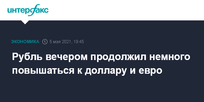 Как отмечают эксперты "Интерфакс-ЦЭА", рубль продолжает немного подрастать к доллару и евро на вечерних торгах на фоне растущей нефти и ожиданий смягчения геополитической напряженности между Россией и США перед возможной встречей между Путиным и Байденом. Президент США заявил, что рассчитывает на переговоры с президентом РФ во время поездки в Европу в июне.