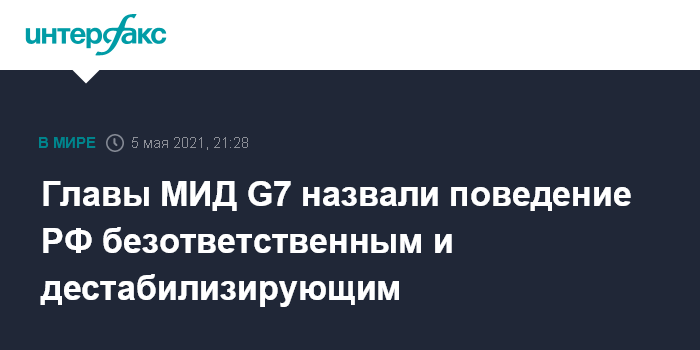"Мы глубоко обеспокоены сохранением негативной модели безответственного и дестабилизирующего поведения России. Это включает в себя наращивание российских вооруженных сил на границах Украины и в незаконно аннексированном Крыму, ее злонамеренные действия, направленные на подрыв демократических систем других стран, злонамеренную киберактивность и использование дезинформации", - говорится в коммюнике, принятом по итогам встречи министров G7.