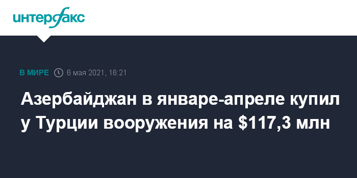 Москва. 6 мая. INTERFAX.RU - Азербайджан по итогам января-апреля 2021 года вышел на вторую позицию по закупкам турецкого вооружения, сообщает турецкое агентство "Анадолу".