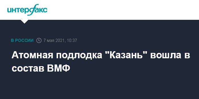 В апреле источники в промышленности сообщили "Интерфаксу", что многоцелевая атомная подлодка "Казань" в ближайшее время совершит контрольный выход в море, после этого ее планируют включить в состав ВМФ РФ. "Передача подлодки флоту запланирована на май", - сказал один из источников.