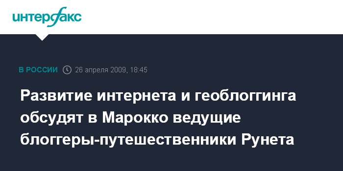 Москва. 26 апреля. INTERFAX.RU - В Марокко с 7 по 14 мая состоится Третий слет блоггеров-путешественников Рунета, на который соберутся около 70 ведущих блоггеров русскоязычной части интернета, профессиональные фотографы и представители крупнейших российских туркомпаний.