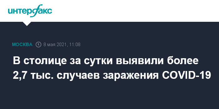 Москва. 8 мая. INTERFAX.RU - В Москве за последние сутки зафиксировали 2 765 случаев заражения коронавирусом, следует из данных оперативного штаба по контролю ситуации с COVID-19.