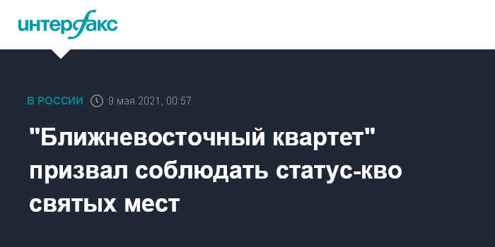 Москва. 9 мая. INTERFAX.RU - Спецпредставители "квартета" международных посредников по ближневосточному урегулированию в составе России, США, ЕС и ООН призвали соблюдать и уважать статус-кво святых мест. Об этом было сказано в совместном заявлении спецпредставителей по итогам консультаций проведенных в субботу.