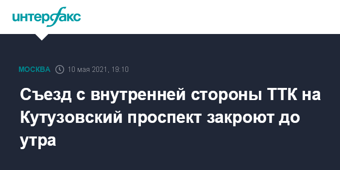 Москва. 10 мая. INTERFAX.RU - Съезд с внутренней стороны Третьего транспортного кольца на Кутузовский проспект в сторону области перекроют с вечера понедельника до утра вторника из-за ремонтных работ в тоннеле, сообщает столичный департамент транспорта.
