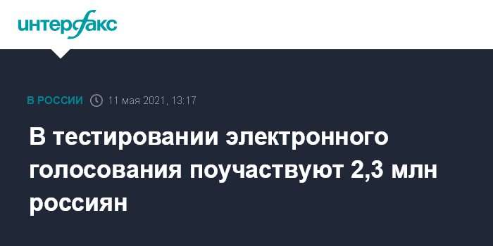 Москва. 11 мая. INTERFAX.RU - В тестировании системы дистанционного электронного голосования (ДЭГ), как ожидается, примут участие около 2,3 млн россиян, сообщил представитель ПАО "Ростелеком" Юрий Сатиров. Заявки от желающих принимались через "Госуслуги" с 21 апреля по 7 мая.