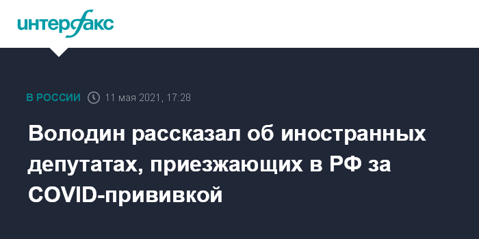 Москва. 11 мая. INTERFAX.RU - Парламентарии из других стран приезжают в РФ, чтобы пройти вакцинацию "Спутником V", заявил председатель Госдумы Вячеслав Володин, комментируя сообщения о том, что немецкий депутат от Левой партии Дитер Дэм на днях привился этой российской вакциной в Москве.