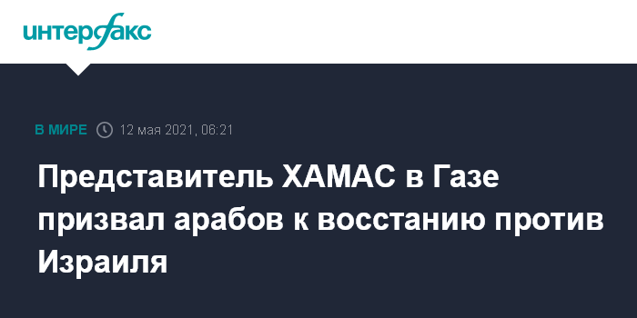 Москва. 12 мая. INTERFAX.RU - Представитель боевого крыла движения ХАМАС в секторе Газа Абу Убайда в эфире телеканала "Аль- Акса" призвал арабских граждан Израиля к "восстанию".