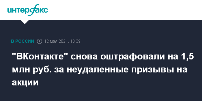 "ВКонтакте" снова оштрафовали на 1,5 млн руб. за неудаленные призывы на акции
