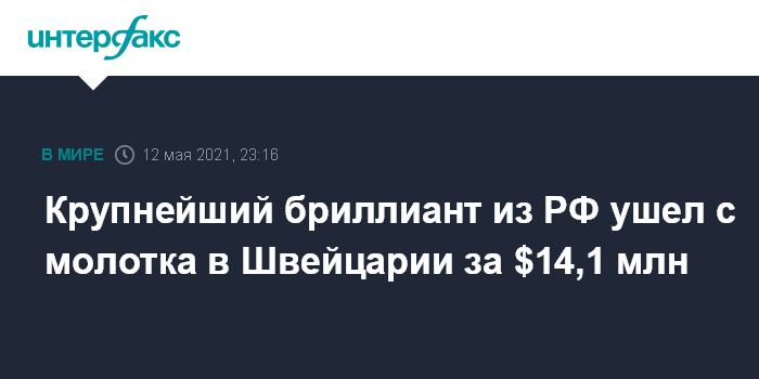 Крупнейший бриллиант из РФ ушел с молотка в Швейцарии за $14,1 млн