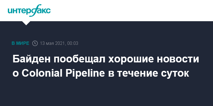 Москва. 12 мая. INTERFAX.RU - Президент США Джо Байден заявил журналистам в Белом доме, что ожидает хороших новостей о ситуации с трубопроводом Colonial Pipeline в течение ближайших суток.