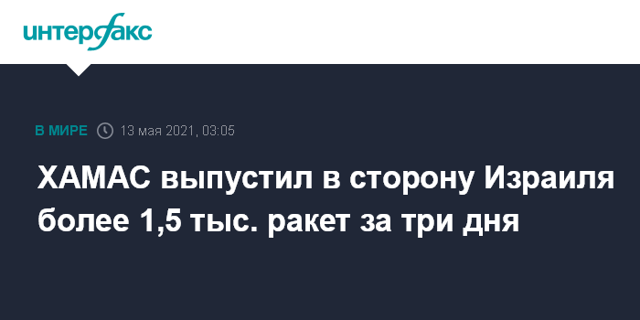 Москва. 13 мая. INTERFAX.RU - Более 1,5 тыс. ракет были выпущены с территории сектора Газа в сторону Израиля за последние три дня, сообщили израильские военные.