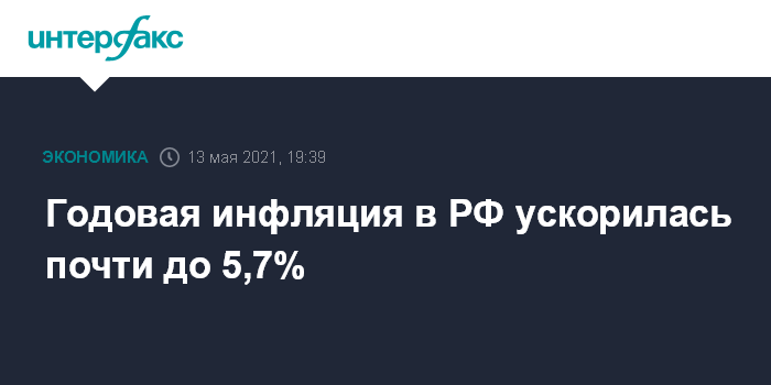 Из среднесуточных данных Росстата следует, что годовая инфляция в РФ на 11 мая ускорилась почти до 5,7% (5,67% без округления до десятых) с 5,5% (5,53%) на конец апреля после 5,8% (5,79%) на конец марта (это было максимальное значение с ноября 2016 года, когда она равнялась также 5,8%), 5,7% на конец февраля, 5,2% на конец января и 4,9% на конец декабря.