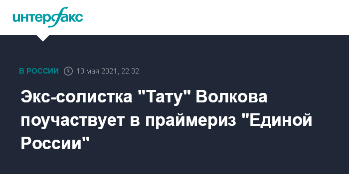 Москва. 13 мая. INTERFAX.RU - Бывшая участница группы "Тату" Юлия Волкова зарегистрирована кандидатом для участия в электронном предварительном голосовании от партии "Единая Россия" в Ивановской области, сообщается на сайте "единороссов".