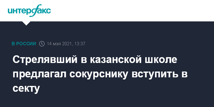 Москва. 14 мая. INTERFAX.RU - Устроивший стрельбу с девятью жертвами в Казани бывший студент колледжа при Татарском институте содействия бизнесу (ТИСБИ) Ильназ Галявиев предлагал сокурснику вступить в секту, сообщила ректор ТИСБИ Нэлла Прусс журналистам в пятницу.