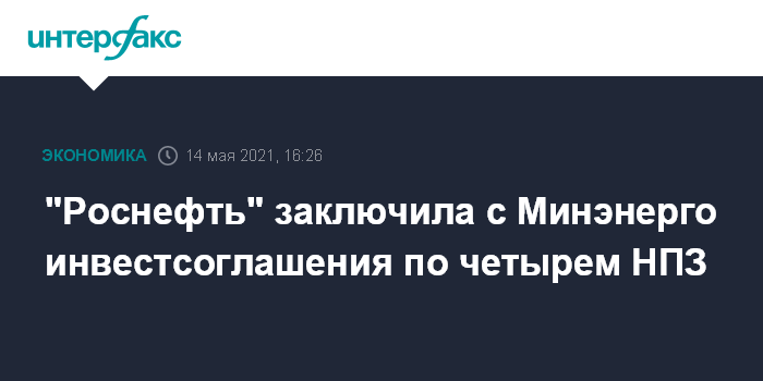 Москва. 14 мая. INTERFAX.RU - "Роснефть" сообщила, что заключила соглашения с Министерством энергетики в целях стимулирования проектов строительства новых производственных мощностей глубокой переработки на четырех НПЗ.