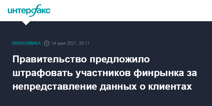 Москва. 14 мая. INTERFAX.RU - Правительство предложило ввести в Налоговый кодекс с января 2022 года штрафы для участников финансового рынка за непредставление или представление неполной информации в Федеральную налоговую службу (ФНС) о клиентах.