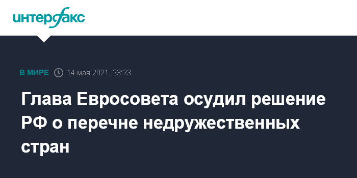 Москва. 14 мая. INTERFAX.RU - Глава Евросовета Шарль Мишель назвал "эскалацией" решение России о перечне иностранных государств, совершающих недружественные действия в отношении Москвы.