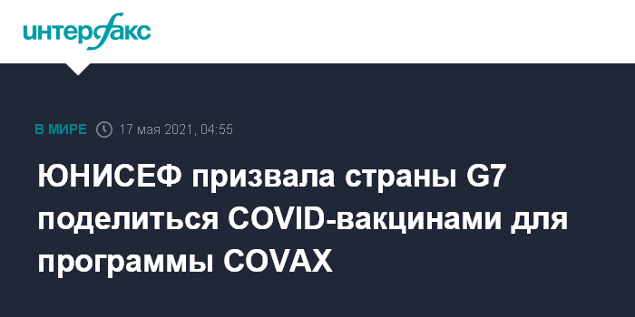 ЮНИСЕФ призвала страны G7 поделиться COVID-вакцинами для программы COVAX