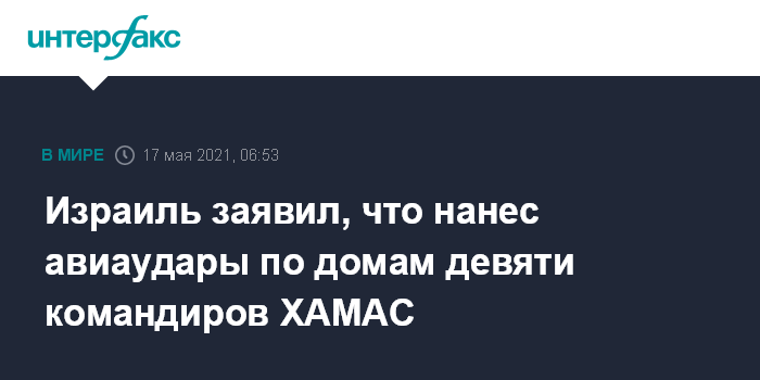Москва. 17 мая. INTERFAX.RU - Армия обороны Израиля заявляет, что в течение последних часов авиация нанесла удары по домам девяти командиров ХАМАС в секторе Газа, передает The Times of Israel.