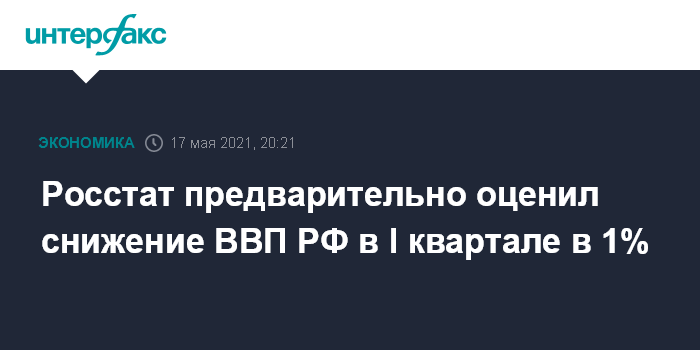 Москва. 17 мая. INTERFAX.RU - ВВП РФ в I квартале 2021 года снизился на 1,0% по сравнению с I кварталом 2020 года. Такую предварительную оценку опубликовал в понедельник Росстат.