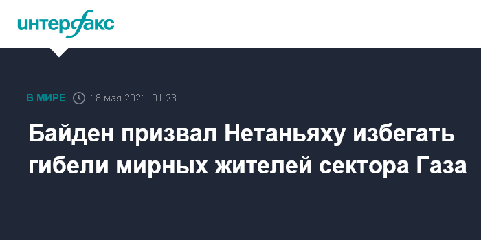 Москва. 18 мая. INTERFAX.RU - Президент США Джо Байден в ходе телефонного разговора с премьером Израиля Биньямином Нетаньяху призвал делать все возможное, чтобы избегать гибели мирных жителей при ударах по сектору Газа, сообщает Белый дом.