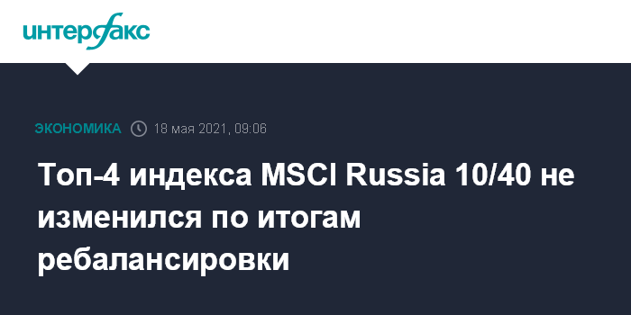 Москва. 18 мая. INTERFAX.RU - Список "тяжеловесов" индекса MSCI Russia 10/40, который строится на основе индекса MSCI Russia Standard, по итогам ребалансировки не изменился, говорится в сообщении индексного провайдера MSCI.