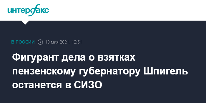 Шпигель останется под стражей до 20 августа 2021 года, сообщили "Интерфаксу" в пресс-службе суда.
