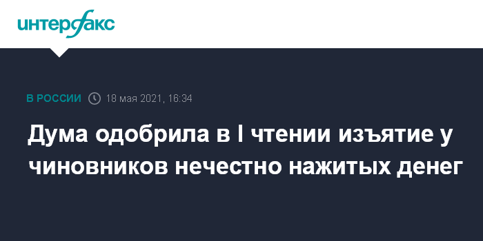 Москва. 18 мая. INTERFAX.RU - Госдума во вторник приняла в первом чтении правительственный проект закона, который законодательно закрепляет возможность изымать денежные средства чиновников, нажитые нечестным путем.