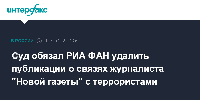 Суд обязал РИА ФАН удалить публикации о связях журналиста "Новой газеты" с террористами
