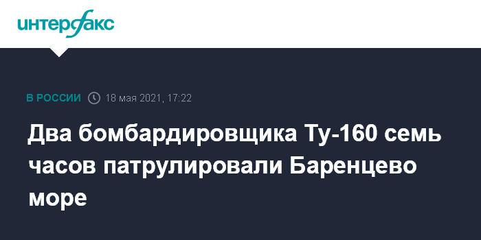 Москва. 18 мая. INTERFAX.RU - Два российских стратегических бомбардировщика Ту-160 во вторник провели патрулирование нейтральных вод Баренцева моря, сообщили в Минобороны РФ.